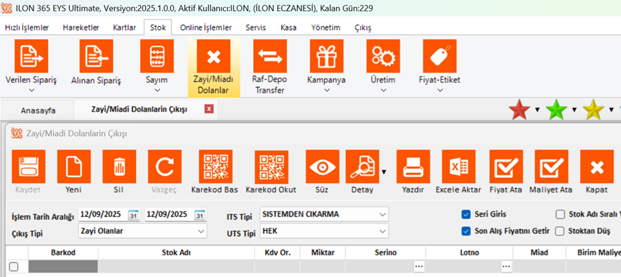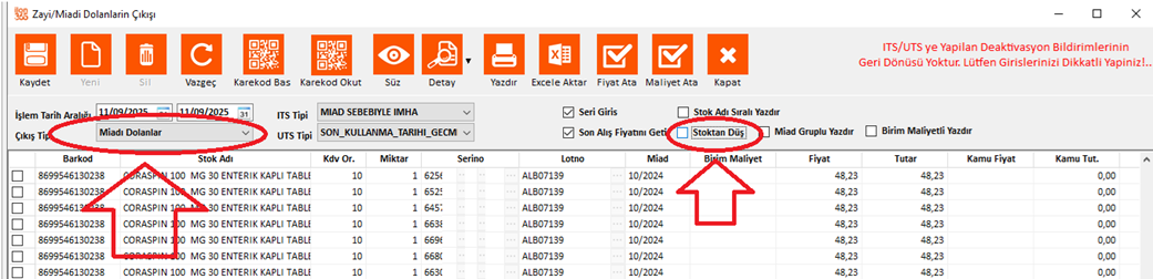ekrandan çıkış tipinin miadı dolanlar olarak seçildiğinden ve stoktan düş seçeneğinin