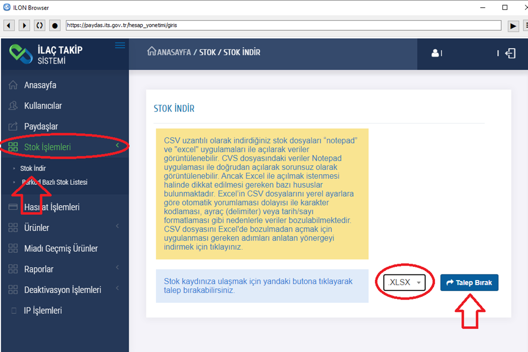 İTS panelinden stok listenizi indirdikten sonra İLON stok