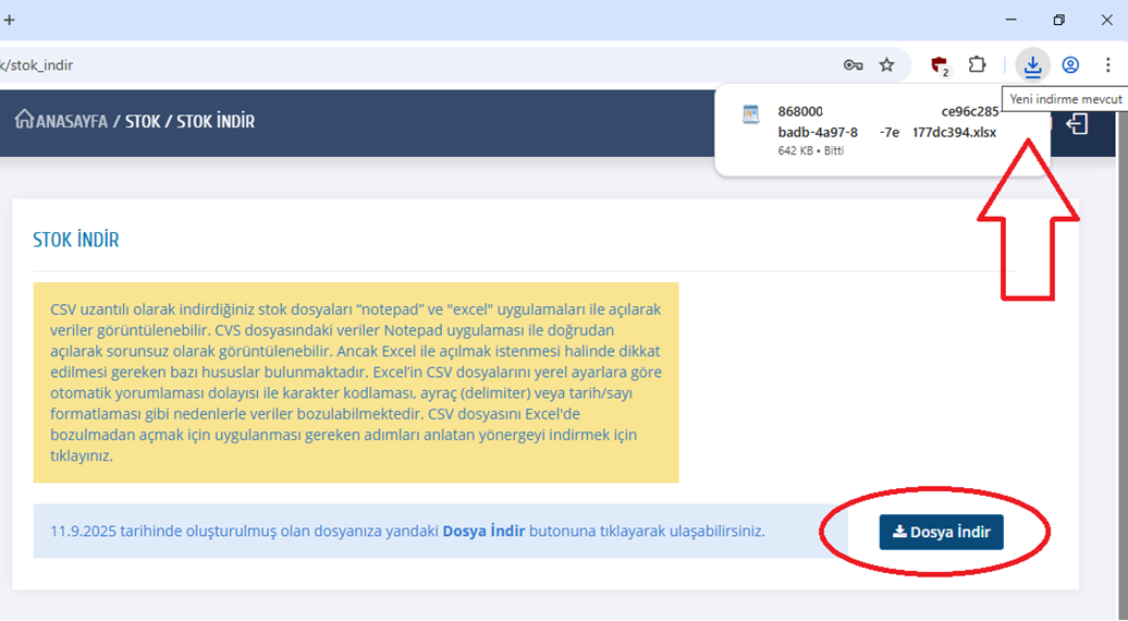panelden Stok işlemleri=>Stok İndir butonlarına tıklayınız. İndirme formatı