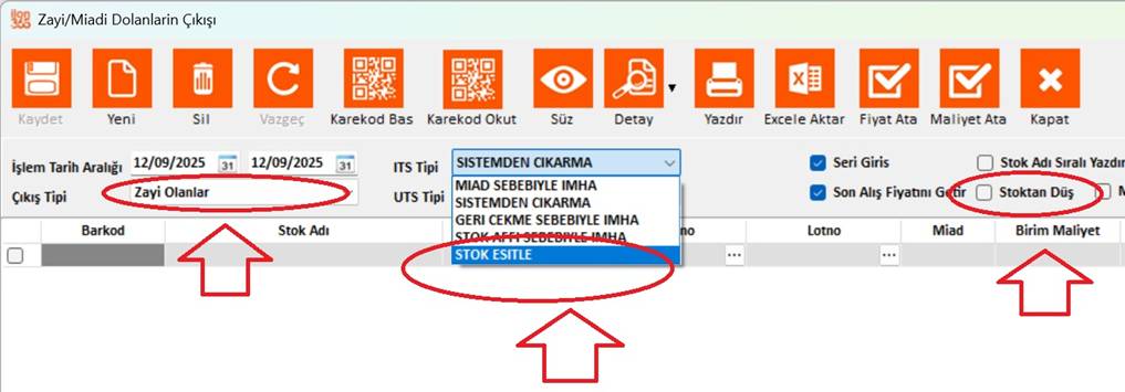 Stok Menüsündeki Zayi/Miadı Dolanlar butonuna tıklayın.